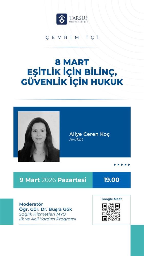 Bölümümüz İlk ve Acil Yardım Programı 8 Mart Dünya Kadınlar Günü kapsamında toplumsal farkındalığın artırılması ve kadın haklarına ilişkin hukuki bilincin güçlendirilmesi amacıyla “8 Mart: Eşitlik İçin Bilinç, Güvenlik İçin Hukuk” başlıklı çevrim içi bir söyleşi düzenlenecektir. Söz konusu etkinlikte; kadın hakları, toplumsal cinsiyet eşitliği, kadınların hukuki güvenceleri ve hak arama yolları gibi konular ele alınacaktır. Programda ayrıca, hukukun bireylerin güvenli ve eşit bir yaşam sürmesindeki rolü ile toplumsal farkındalığın artırılmasına yönelik değerlendirmelere de yer verilecektir. Etkinliğe konuşmacı olarak Av. Aliye Ceren Koç katılım sağlayacak olup programın moderatörlüğü, Sağlık Hizmetleri MYO İlk ve Acil Yardım Programı öğretim elemanı Öğr. Gör. Dr. Büşra Gök tarafından gerçekleştirilecektir. Etkinlik, 9 Mart 2026 Pazartesi günü saat 19.00’da Google Meet platformu üzerinden çevrim içi olarak gerçekleştirilecektir. Katılım bağlantısına etkinlik afişinde yer alan QR kod aracılığıyla erişilebilecektir.